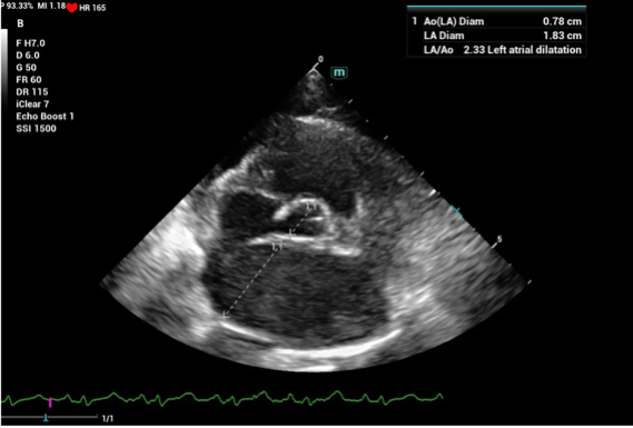 Đo kích thước nhĩ trái thường được sử dụng qua phép đo LA:Ao. Kích thước bình thường của chỉ số này thường <1.6, khi giá trị này >1.8-2.0 hoặc đường kính LA > 18-19mm thì mèo sẽ có nguy cơ phát triển suy tim và/hoặc thuyên tắc động mạch (ATE – giai đoạn B2).