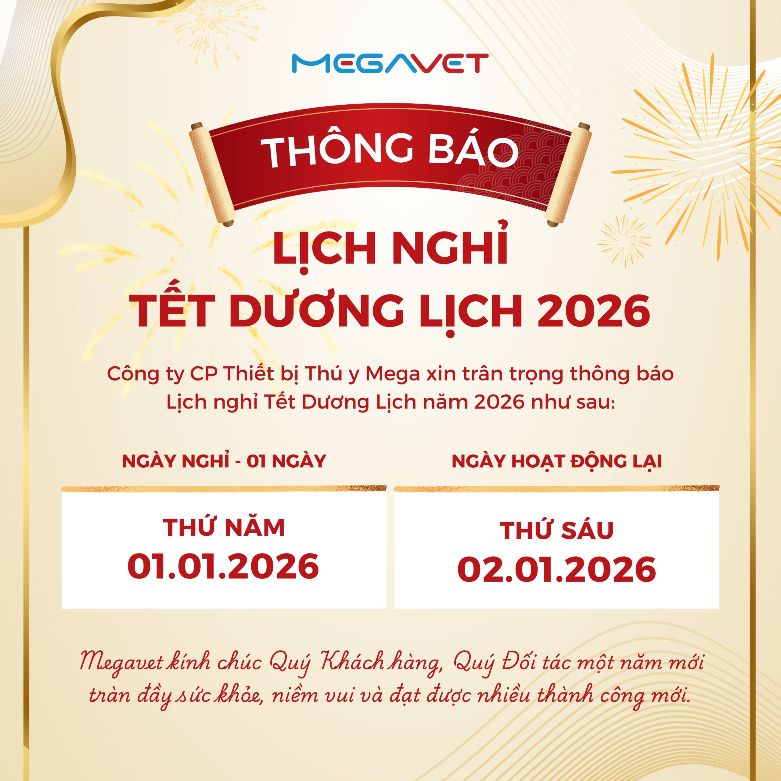 🎉 Nhân dịp năm mới 2026, MEGAVET chúc Quý Khách hàng và Đối tác một kỳ nghỉ Tết Dương lịch vui vẻ, an lành và tràn đầy năng lượng để chào đón một năm mới thành công rực rỡ!